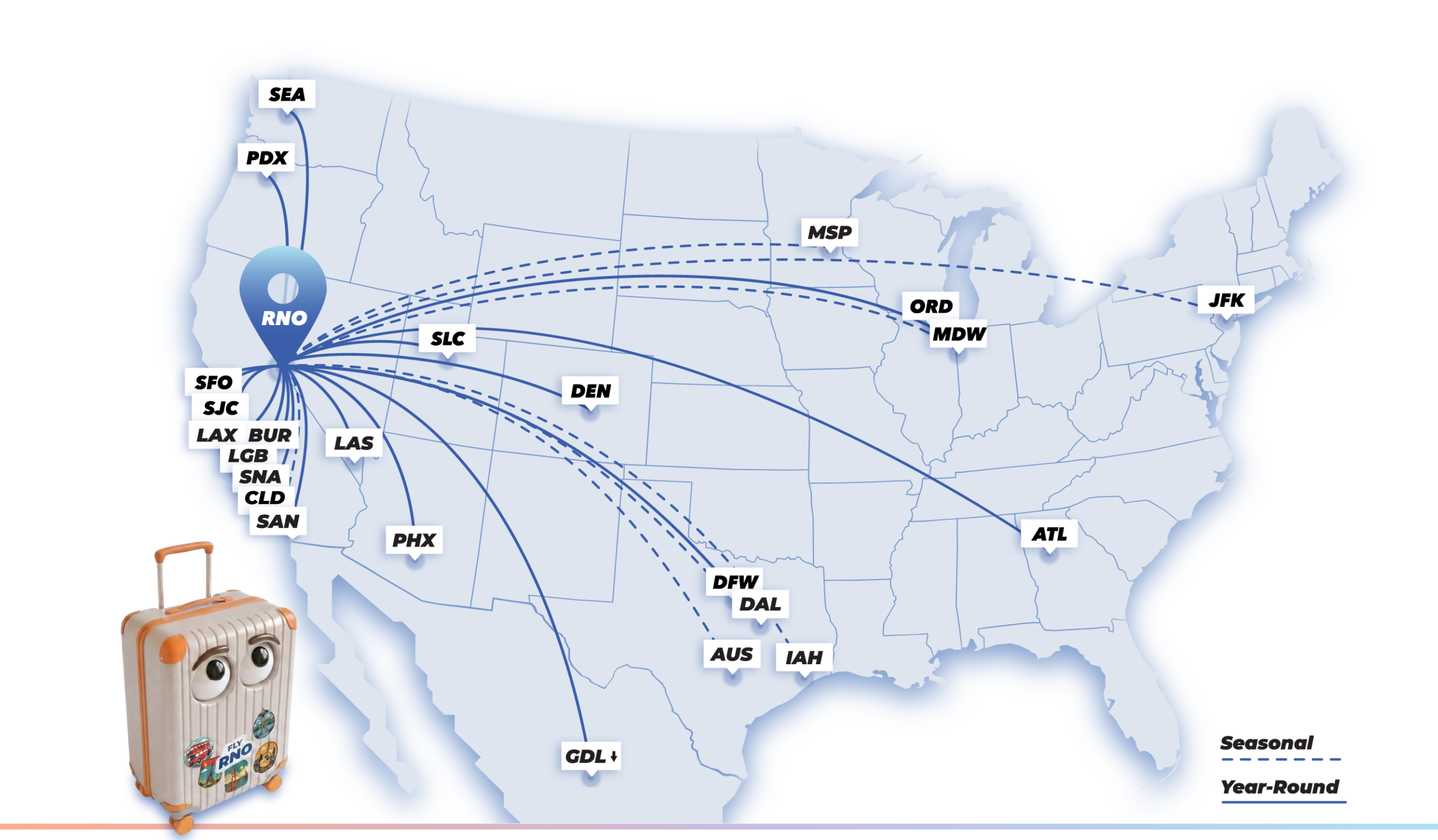 If you want your next trip to have mural-painted streets, bright stadium lights, or honky-tonk grooves, RNO makes flying there easy.